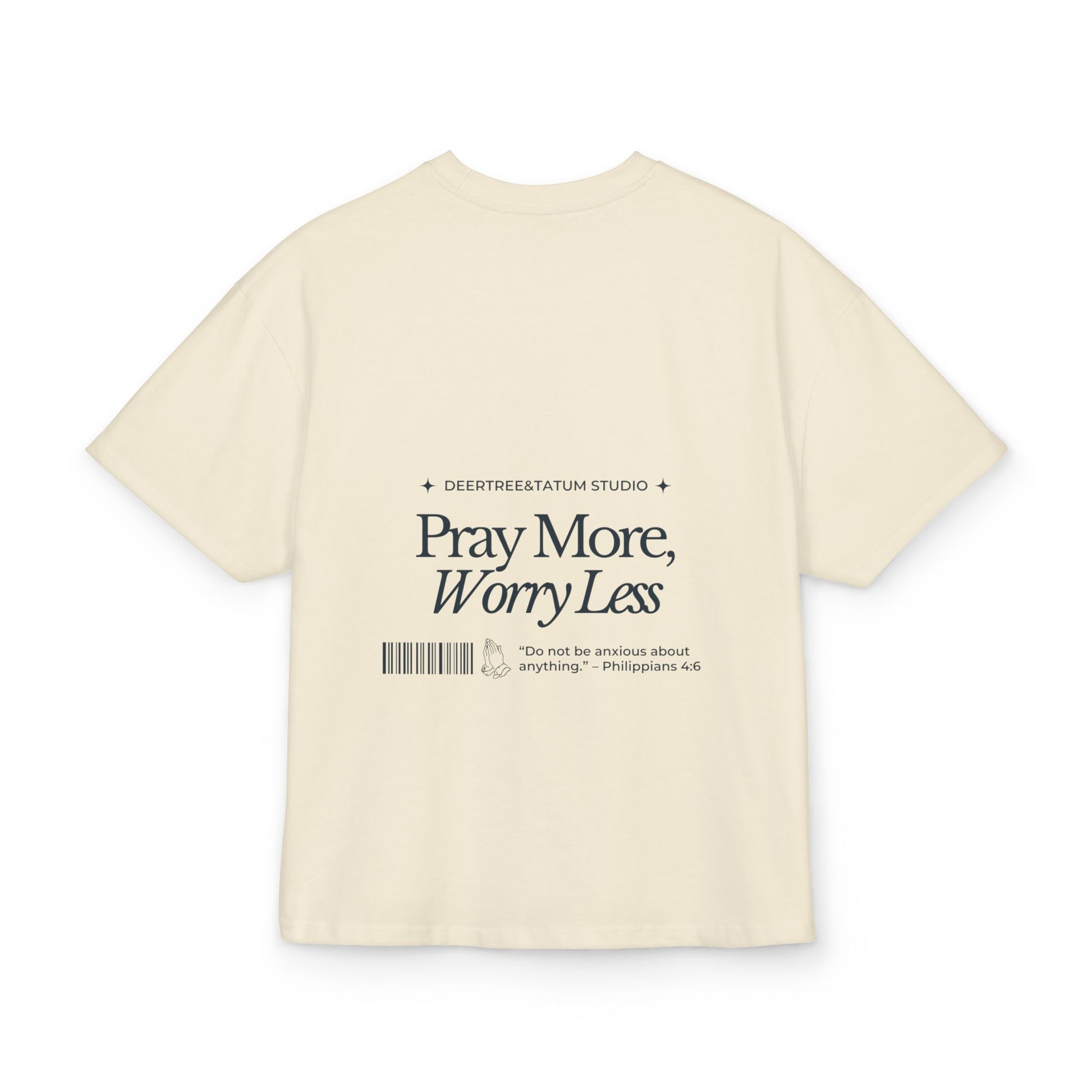 This oversized cotton tee carries a quiet, steady message: pray more, worry less. The heavy, boxy silhouette drapes like a familiar shelter — shoulders dropped, body relaxed — so you can move through a busy day or a slow Sunday with a calm center. The dense 100% cotton holds printed lettering with clarity, and the substantial weight gives the shirt a comforting, grounded feel that settles the shoulders and softens the rush. Wear it to early morning prayers, group bible study, volunteer shifts, or simple coffee runs when you want your faith to speak softly but clearly. It pairs naturally with worn jeans, cozy layers, or an open cardigan when the weather leans cool. This tee reads like a gentle reminder and becomes part of the quiet routines that steady you.
